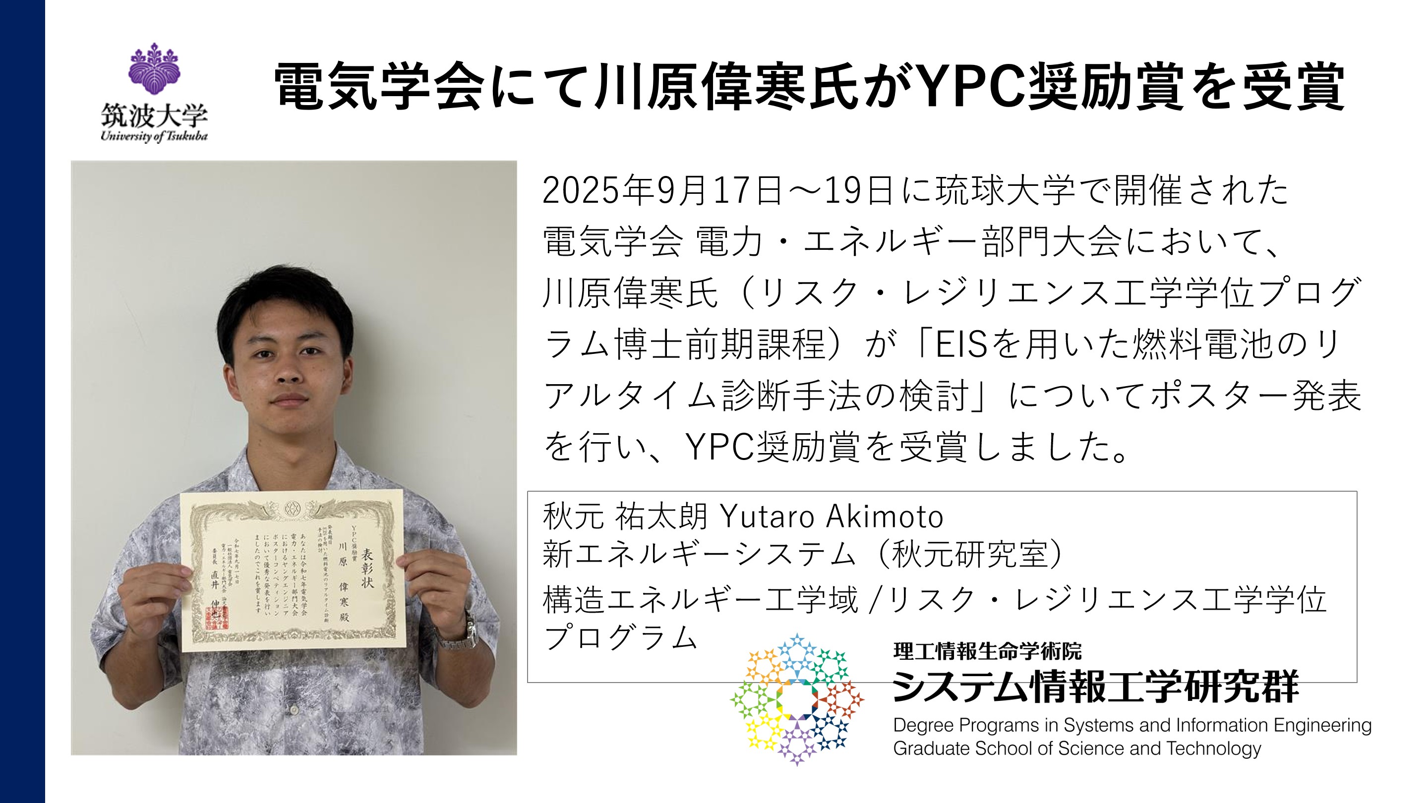2025年9月17日~19日に琉球大学で開催された電気学会電力・エネルギー部門大会において、川原偉寒氏(リスク・レジリエンス工学学位プログラム博士前期課程)が「EISを用いた燃料電池のリアルタイム診断手法の検討」についてポスター発表を行い、YPC奨励賞を受賞しました。