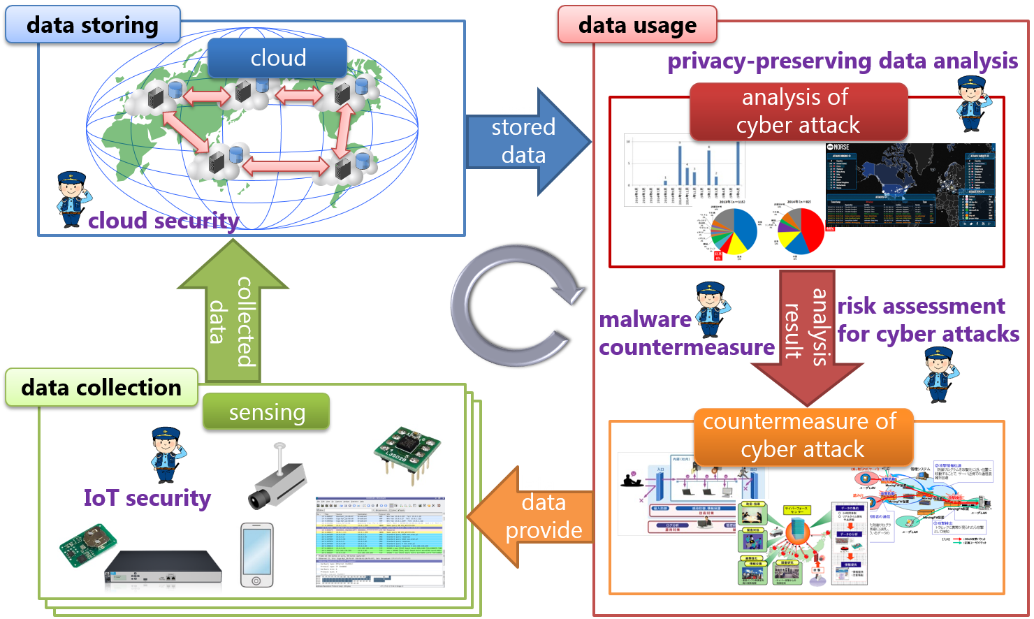 インターネット網や携帯電話回線網等のネットワークが爆発的に普及しているなか,ネットワークを利用したコンピュータを安心して利用できることは非常に重要です. 近年,日本を含め世界的にサイバー攻撃が急増しています.このような攻撃に対抗するため,あらゆる箇所でアンチウィルスソフトやファイアウォール,IDS/IPS等の基本的な対策が導入されています. しかしながら,このような基本的な対策だけでは,近年の高度なサイバー攻撃の被害を防ぐことは難しいと言われています.